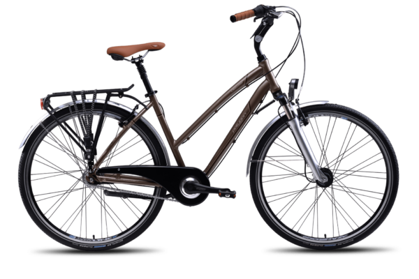 The Deluxe 7 is everything an urban commuter could ask for and more. The light weight 6061 alloy frame features an upright position for confident handling in traffic and a stepthrough design for easy mounts and dismounts while the SR Suntour suspension fork and fat 700x40c tires takes the sting out of rough roads. Low maintenance Shimano 7 speed internal hub handles the shifting duties while full fenders and pant guard help keep road spray and grease at bay. There's even a sturdy rear cargo rack, convenient kickstand and lighting system with dynamo hub for worry-free night time commutes.